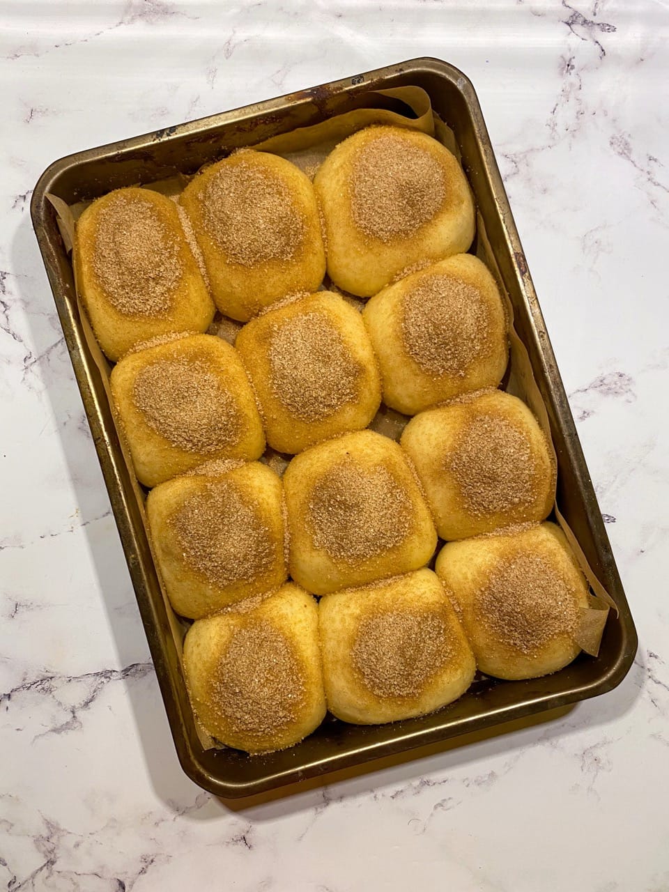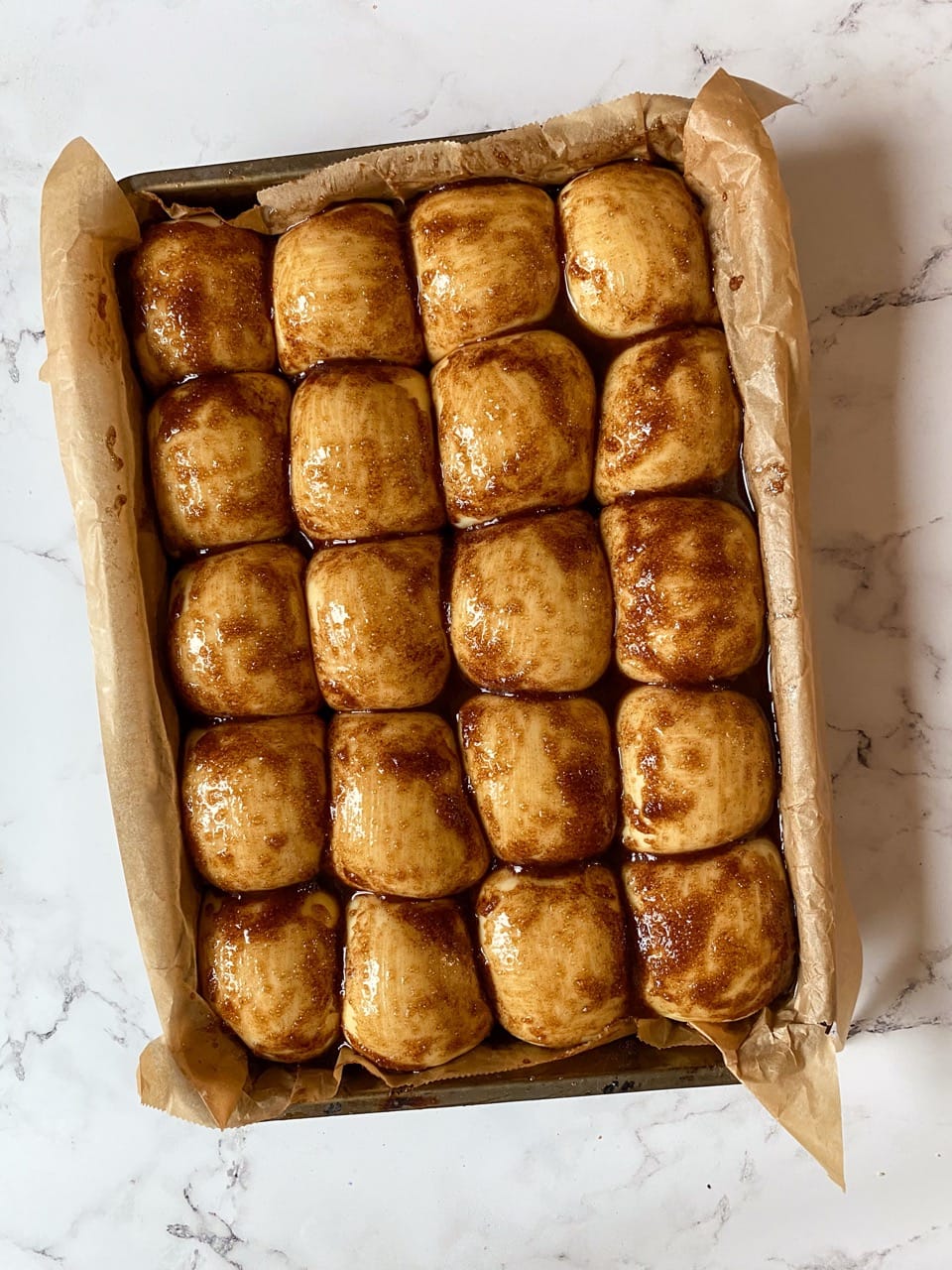 Jeśli macie ochotę wynieść te cynamonki na kolejny poziom, blaszkę wysmarujcie masłem, a następnie wysypcie cukrem – po upieczeniu trzeba będzie szybko wyjąć drożdżówki z formy, a na ich spodzie po ostudzeniu utworzy się pyszny i chrupiący karmel.