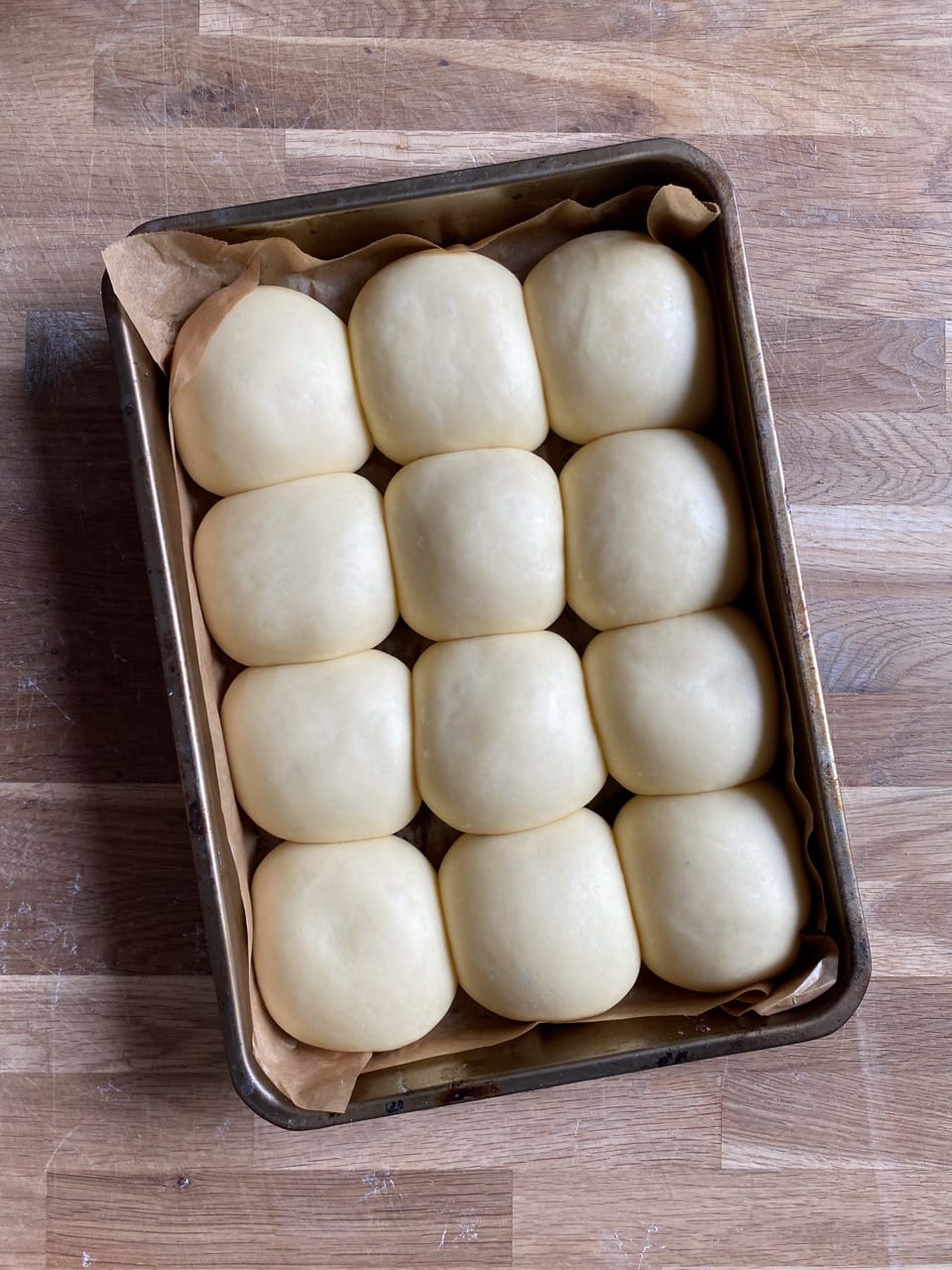 Wyrośnięte ciasto dzielimy na kulki o wadze 60 gramów – lub po prostu na 12 w miarę równych kawałków. Pomóżcie sobie mąką jeśli ciasto wam się klei.