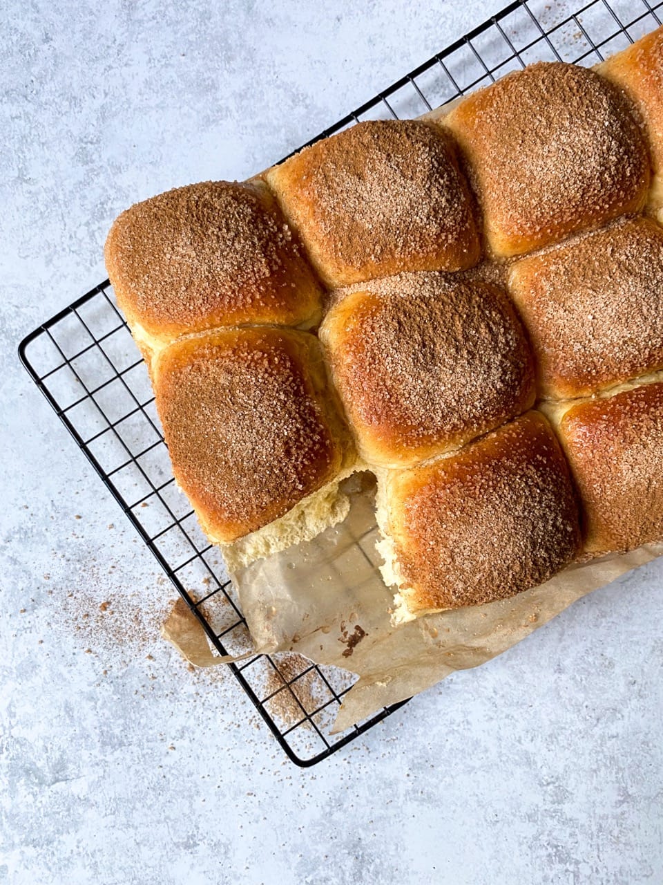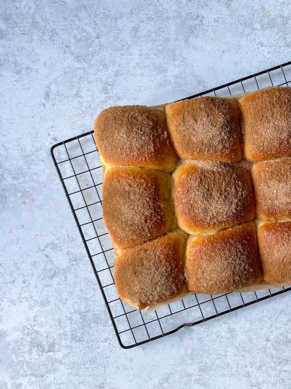 Po lekkim ostudzeniu polecam wyjąć cynamonki z formy, aby nie zaparzyły się – w innym przypadku będą miękkie i aż za mokre na bokach.