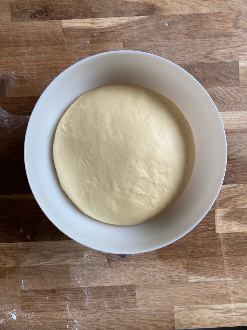 Po tym czasie ciasto powinno już ładnie urosnąć, zwiększyć objętość i być puszyste w dotyku. W tym momencie je przebijamy: chcemy je prawie całkowicie odpowietrzyć i naciągnąć jego strukturę (jak na filmiku poniżej). Dzięki temu drożdżówki będą delikatniejsze, smaczniejsze i będą miały piękną strukturę. Nie bójcie się tego robić mocno. Naprawdę tutaj nie chcemy być delikatni.